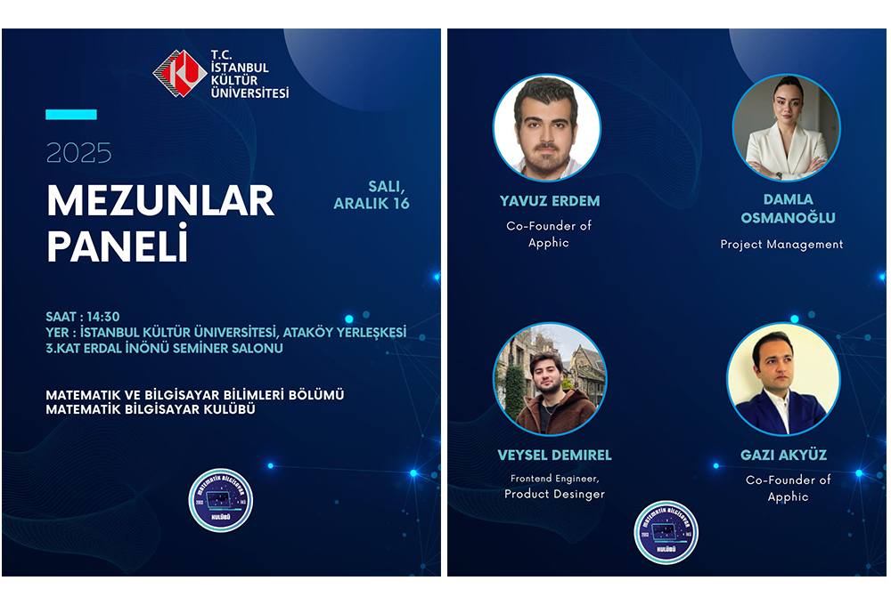 Matematik Bilgisayar Kulübü tarafından, 16 Aralık Salı günü 14.30-15.30 saatleri arasında Bakırköy yerleşkesi Ataköy binasındaki 3. Kat Erdal İnönü Seminer Salonu’nda “Mezunlar Paneli 2025” etkinliği gerçekleştirilecek.